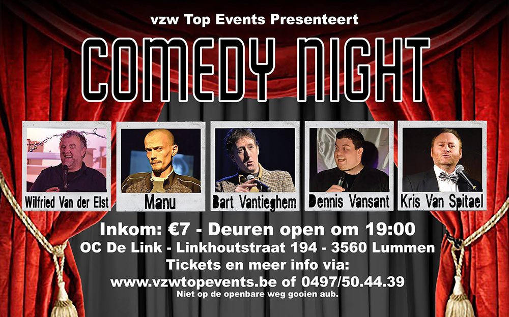 Een avondvullende comedy show. 5 onafhankelijke comedians brengen elk hun eigen stijl en zorgen samen voor een geslaagde avond. Op deze gevarieerde comedy avond wordt het zeker lachen geblazen.