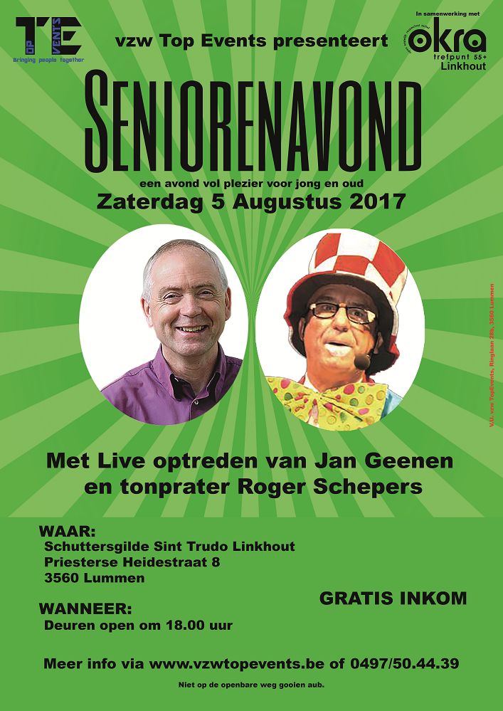 Onze eerst volgende Seniorenavond gaat door op Zaterdag 5 Augustus 2017. Zoals vorig jaar zal Jan Geenen ook weer te gast zijn voor een goed gevulde muziekale avond. Wij hebben ook dit jaar een voorprogramma voorzien voor de vroege vogels onder ons. Niemand minder dan tonprater Roger Schepers zal onze lachspieren komen trainen!